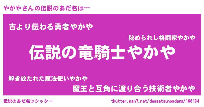 | 男性向けラノベタイトル風あだ名 | 『やかやの憂鬱』『魔弾の王とやかや』 |