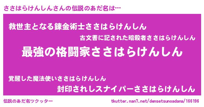 | 男性向けラノベタイトル風あだ名 | 『ささはらけんしん~年齢イコール彼女いない歴の魔法使い~』 |