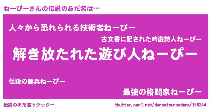 | ヒーロー風カッコイイあだ名 | 『銀牙騎士ネー』『正義の使者ねーぴー』 |
