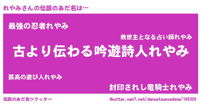| 男性向けラノベタイトル風あだ名 | 『れやみという概念が存在しない退屈な世界 』 |