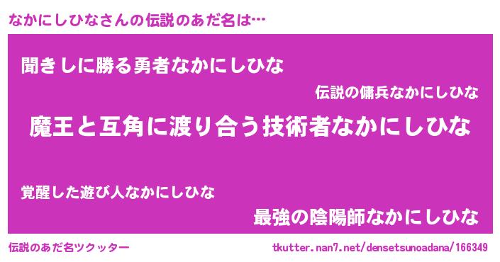 | 男性向けラノベタイトル風あだ名 | 『転生したらなかにしひなだった件』 |