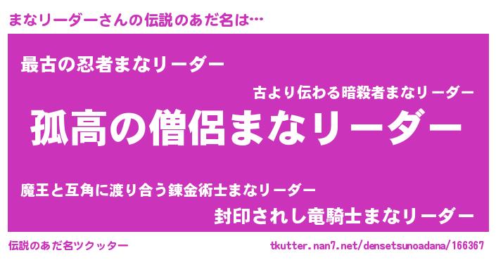 | 女子向けラノベタイトル風あだ名 | 『まなリーダーは平凡を望む』 |