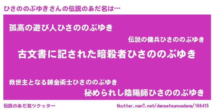 | ヒーロー風カッコイイあだ名 | 『ネオヒサノノブユキ』『暗黒騎士ヒサ』 |