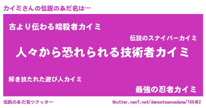 | ヒーロー風カッコイイあだ名 | 『正義の使者カイミ』『ネオカイミ』 |