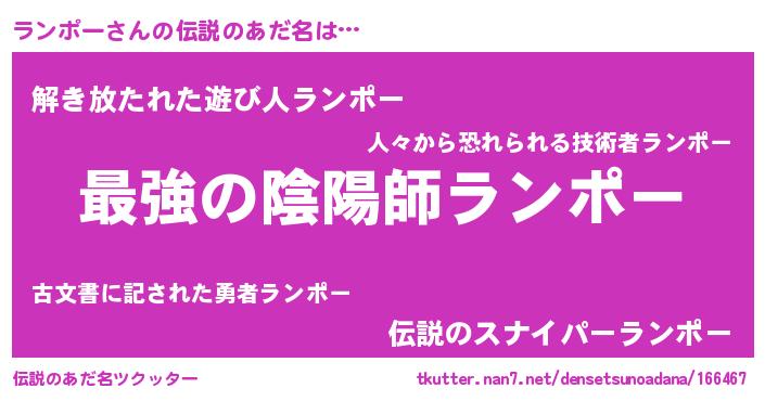 | ヒーロー風カッコイイあだ名 | 『仮面ランダー』『ウルトラランポーマン』 |