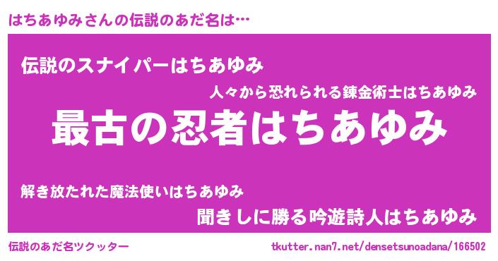 | ファンタジー風あだ名 | 『エターナルハチアユミー』『ゼハチトゥ』 |