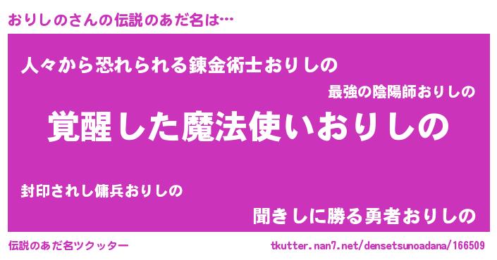 | 男性向けラノベタイトル風あだ名 | 『おりしのに滅ぼされるだけの簡単なお仕事です』 |