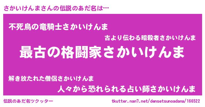 | 男性向けラノベタイトル風あだ名 | 『Re:さかいけんまから始める異世界生活』 |
