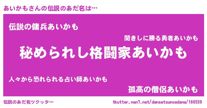 | 女子向けラノベタイトル風あだ名 | 『あいかもなんてお断りですっ。』 |