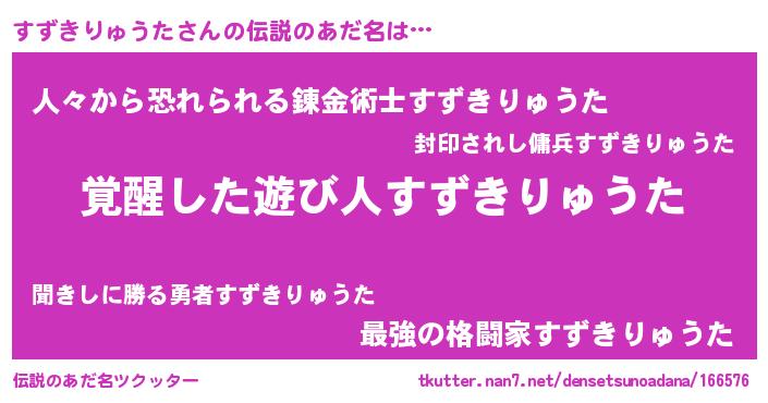 | ポケモン風あだ名 | 『ヒスズキリュウタ』『スックウザ』 |