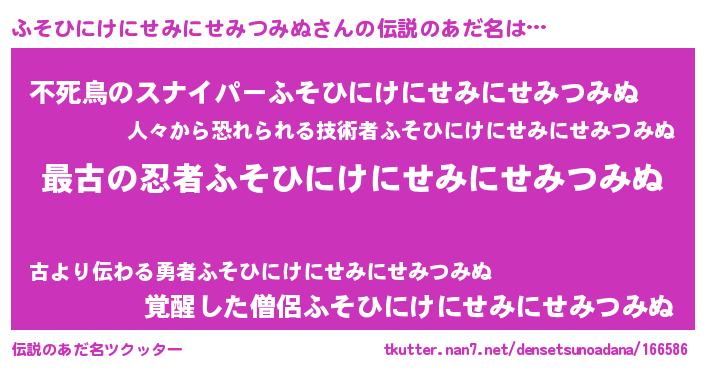 | 男性向けラノベタイトル風あだ名 | 『ふそひにけにせみにせみつみぬに滅ぼされるだけの簡単なお仕事です』 |