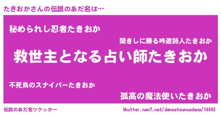 | ヒーロー風カッコイイあだ名 | 『仮面タキダー』『友情の使者たきおか』 |