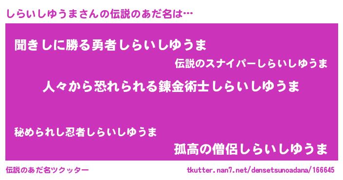 | ヒーロー風カッコイイあだ名 | 『仮面シラダー』『ネオシライシユウマ』 |