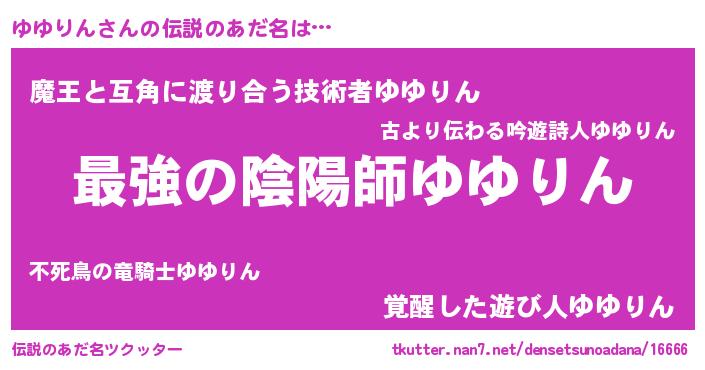 | 女子向けラノベタイトル風あだ名 | 『ゆゆりんの玉の輿計画!』 |