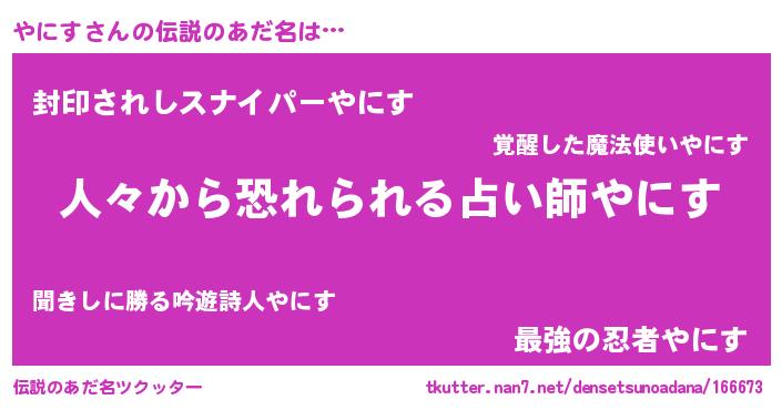 | 意味不明あだ名 | 『眠気覚ましガムやにす味』『自称やにす』 |