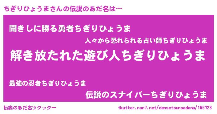 | ヘコむあだ名 | 『ちぎっぺ』『ちぎりひょうま(遠い目)』 |