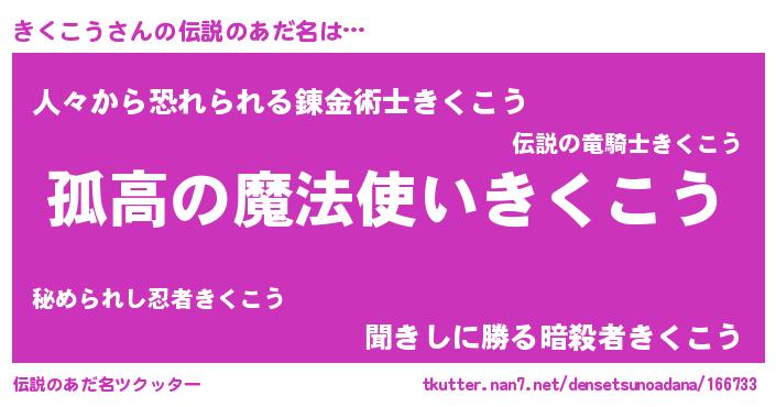 | ヒーロー風カッコイイあだ名 | 『暗黒騎士キク』『超時空戦士キクコウ』 |