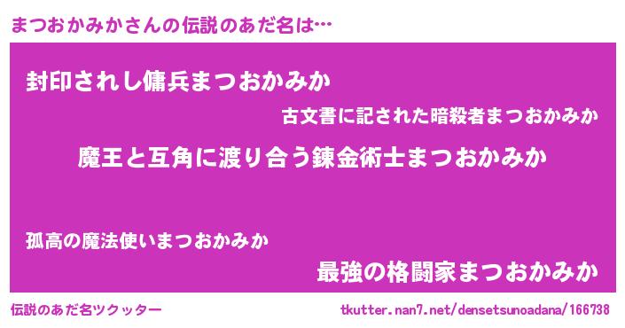 | 男性向けラノベタイトル風あだ名 | 『おまえをオタクにしてやるから、俺をまつおかみかにしてくれ! 』 |