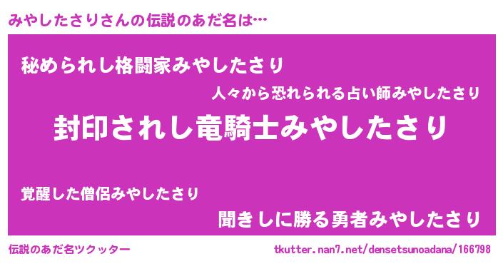 | 胡散臭い通販商品みたいなあだ名 | 『あなたにだけ特別に提供する100年もののヴィンテージワイン…その名も「みやしたさり」』 |