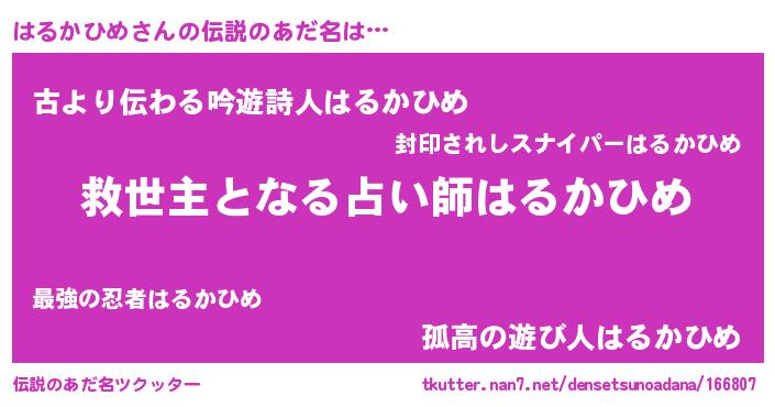| ヘコむあだ名 | 『はるかひめ(笑)』『はる太郎』 |