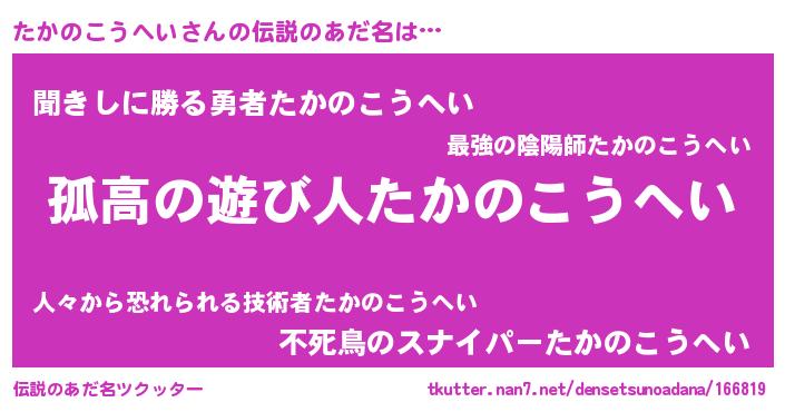 | ヒーロー風カッコイイあだ名 | 『黄金騎士タカ』『ネオタカノコウヘイ』 |