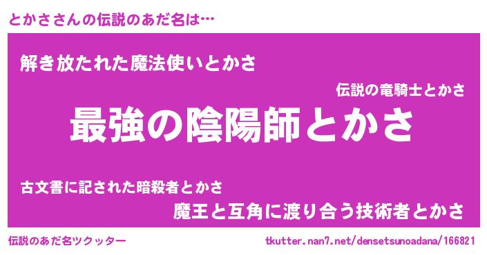 | 女子向けラノベタイトル風あだ名 | 『闇のとかさ』『とかさの婚約者』 |
