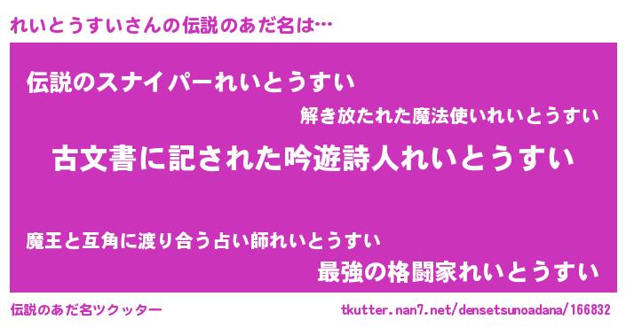 | 男性向けラノベタイトル風あだ名 | 『うちのれいとうすいが世界を掌握している!』 |