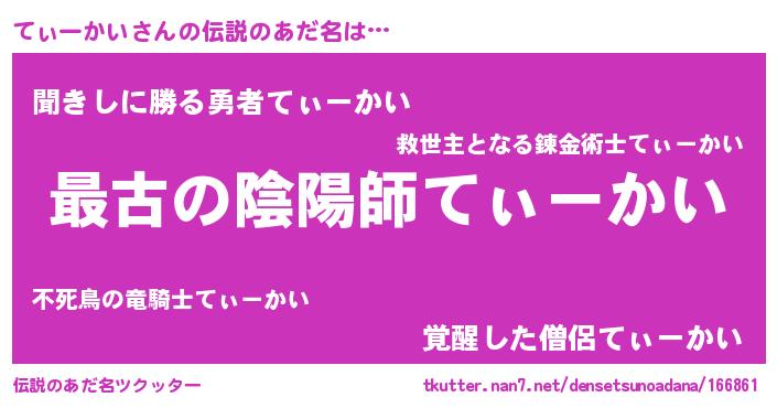 | 男性向けラノベタイトル風あだ名 | 『転生したらてぃーかいだった件』 |