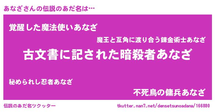 | 意味不明あだ名 | 『永久保存あなざ』『自称あなざ』 |