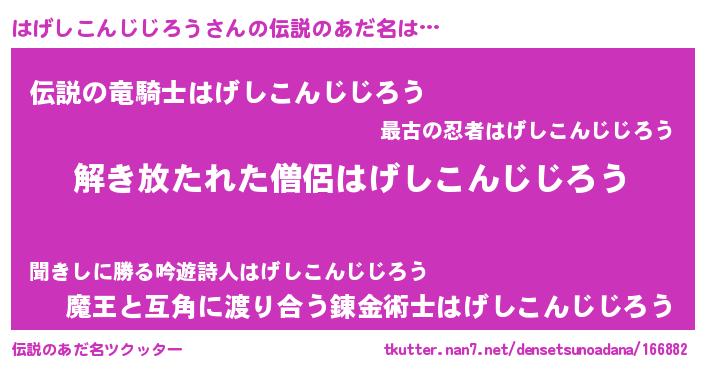 | 男性向けラノベタイトル風あだ名 | 『はげしこんじじろうの嫁は女の子じゃないと思った?』 |