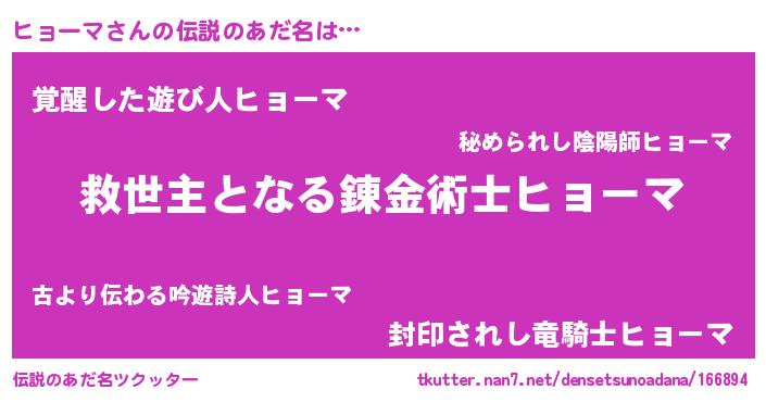 | 男性向けラノベタイトル風あだ名 | 『ノーゲーム・ノーヒョーマ』 |