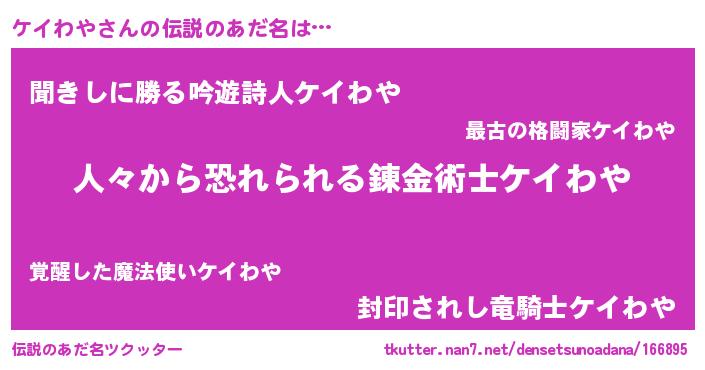 | 意味不明あだ名 | 『めかぶ科ケイわや属』『自称ケイわや』 |