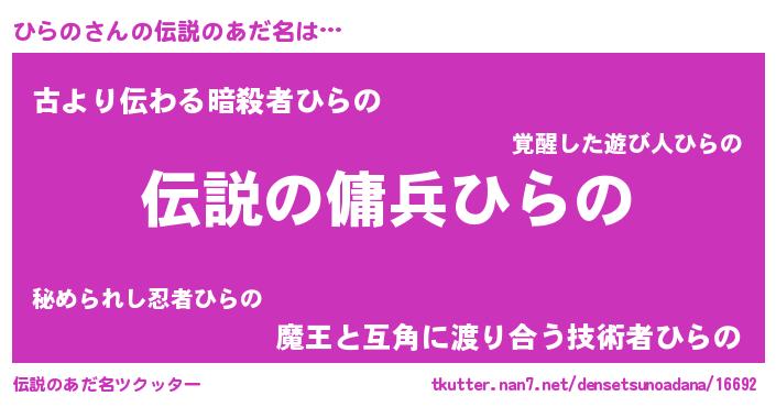 | 男性向けラノベタイトル風あだ名 | 『ひらのの憂鬱』『魔弾の王とひらの』 |