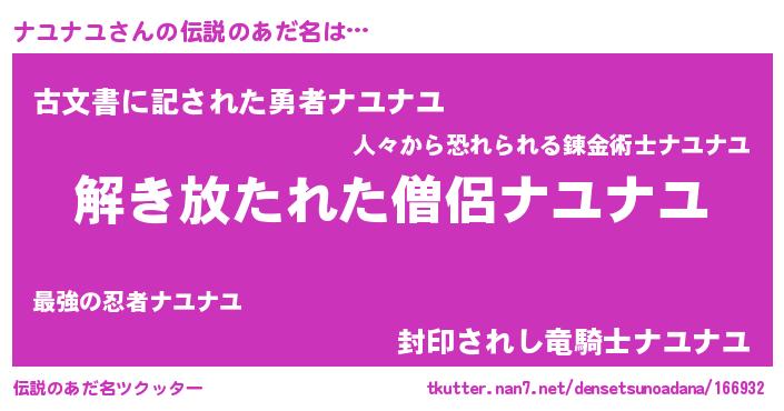 | 男性向けラノベタイトル風あだ名 | 『ナユナユの嫁は女の子じゃないと思った?』 |