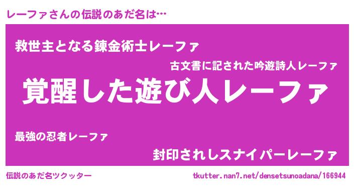 | 意味不明あだ名 | 『住所不定無職レーファ(98歳)』 |