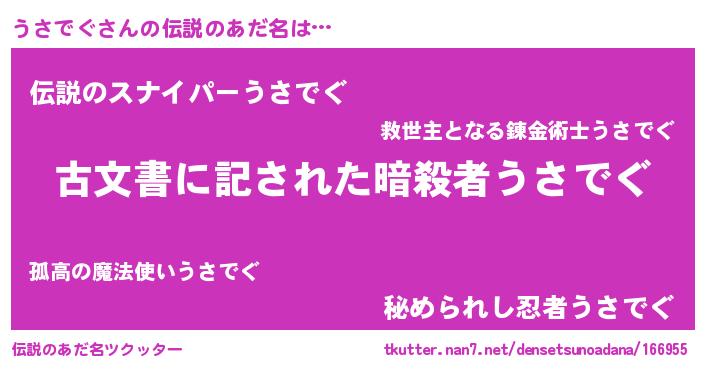 | 男性向けラノベタイトル風あだ名 | 『うさでぐ~年齢イコール彼女いない歴の魔法使い~』 |