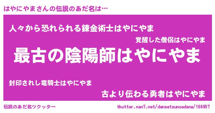 | ヒーロー風カッコイイあだ名 | 『仮面ハヤダー』『慈愛の使者はやにやま』 |