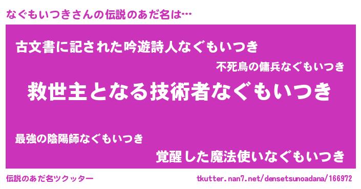 | 男性向けラノベタイトル風あだ名 | 『ノーゲーム・ノーナグモイツキ』 |