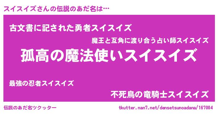 | 意味不明あだ名 | 『自称スイスイズ』『永久保存スイスイズ』 |