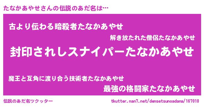 | ヒーロー風カッコイイあだ名 | 『スーパータナカアヤセ』『黄金騎士タナ』 |
