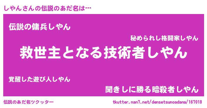 | ヒーロー風カッコイイあだ名 | 『天空の使者しやん』『スーパーシヤン』 |