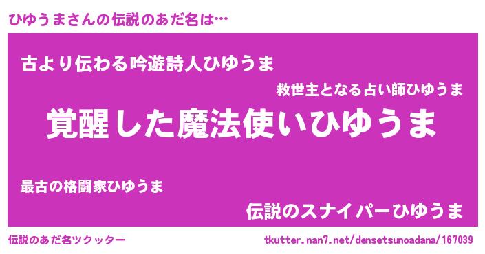 | ヒーロー風カッコイイあだ名 | 『天弓騎士ヒユ』『ネオヒユウマ』 |