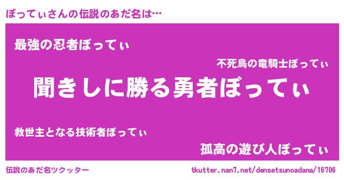 | 男性向けラノベタイトル風あだ名 | 『ぼってぃという概念が存在しない退屈な世界 』 |
