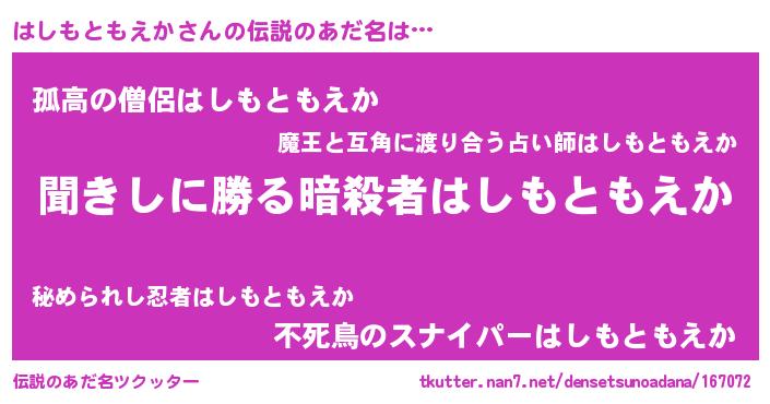 | 意味不明あだ名 | 『自称はしもともえか』 |