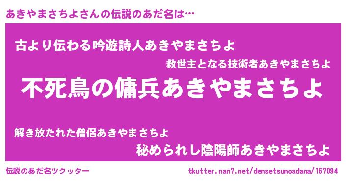 | ヘコむあだ名 | 『あきにゅー』『あきやまさちよ(小並感)』 |