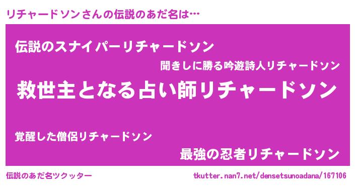 | 男性向けラノベタイトル風あだ名 | 『リチャードソンに滅ぼされるだけの簡単なお仕事です』 |