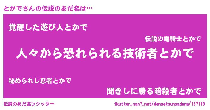 | 男性向けラノベタイトル風あだ名 | 『魔弾の王ととかで』『トカデスレイヤー』 |