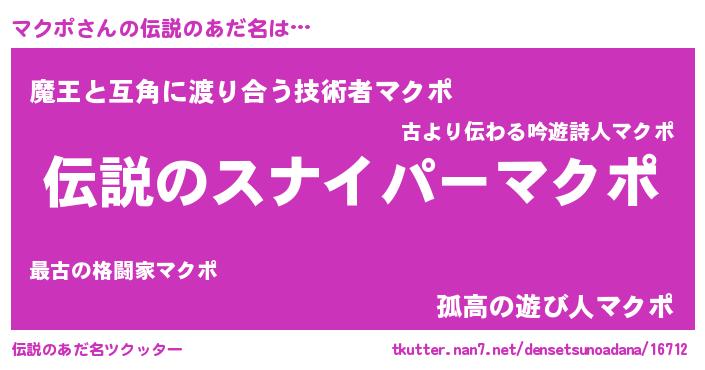 | 男性向けラノベタイトル風あだ名 | 『はたらくマクポさま!』『マクポの憂鬱』 |