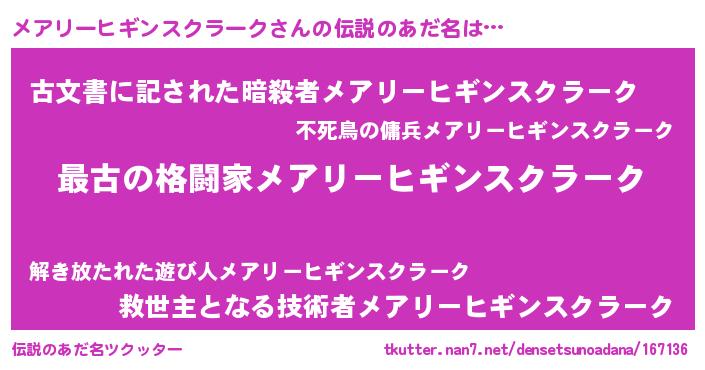 | 欧米人風あだ名 | 『メアリーヒギンスクラーク・ステッグマイヤー』 |