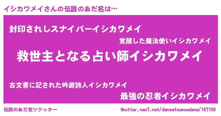 | ヒーロー風カッコイイあだ名 | 『仮面イシダー』『スーパーイシカワメイ』 |